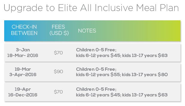 Mandatory All Inclusive Program Fees are per person, per day. The program includes all meals, beverages and non-motorized water sports. Two adults & 7 night stay required. Children 7-11 years old pay 50% off the adult rate. Teens 12-17 years old pay 30% off the adult rate. Children under 6 years old are free. *Mandatory Supplement on December 31st of US$60 per person for Gala Dinner. This promotion is only valid when all inclusive fees are paid in advance prior to check in. RCI subscribing members must book their vacation through RCI and then call: US (866) 394-8332 / CAN (866) 287-0215 to arrange for pre payment of their all-inclusive fee.
